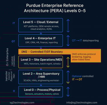 Learn how the Purdue Model (Levels 0–5) bridges IT and OT systems. Discover best practices for DMZ design, segmentation, and cybersecurity in industrial environments.